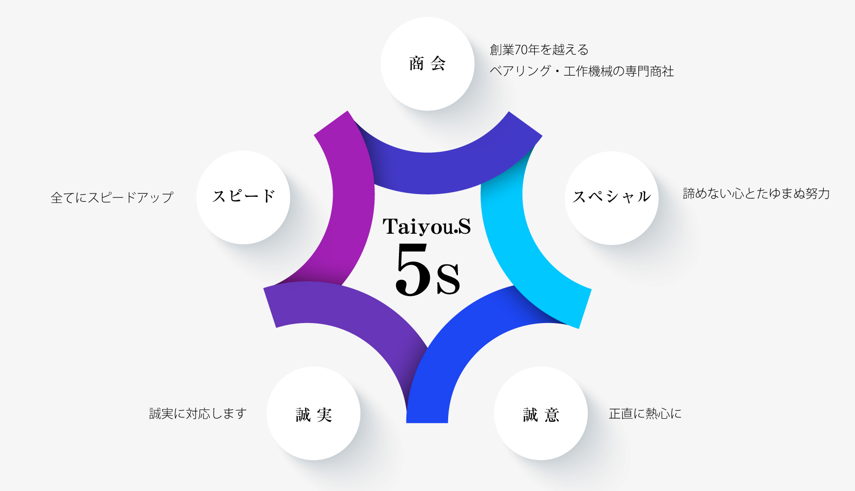 株式会社大陽商会は昭和23年にベアリング販売代理店として創業し、先人たちのたゆまぬ努力により70年以上に渡って事業を展開して参りました。 現在はベアリングはもとより、工作機械から周辺機器まで幅広いニーズに応えられる専門商社として顧客の課題を追及し、提案できる会社として日々精進しております。 これもひとえに皆様方のご理解とご支援の賜物と心より感謝申し上げます。これから大陽商会は創業80年、90年、100年と目指していきますが、社員が自分の仕事や会社に愛着を持ちながら仕事ができるよう個々の意欲、能力を発揮できる環境づくりに努めていきます。 そして経営理念である「顧客、メーカーヘの満足度追求」、「常に新技術に追随できる努力をし、メーカー及び顧客に提案できる会社」、「誠実をモットーに社会に貢献する」を実現すべく全社員が鋭意努力し皆様方の信頼に応えて事業に取り組む所存です。